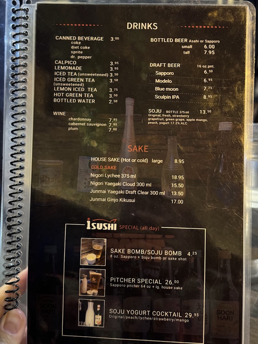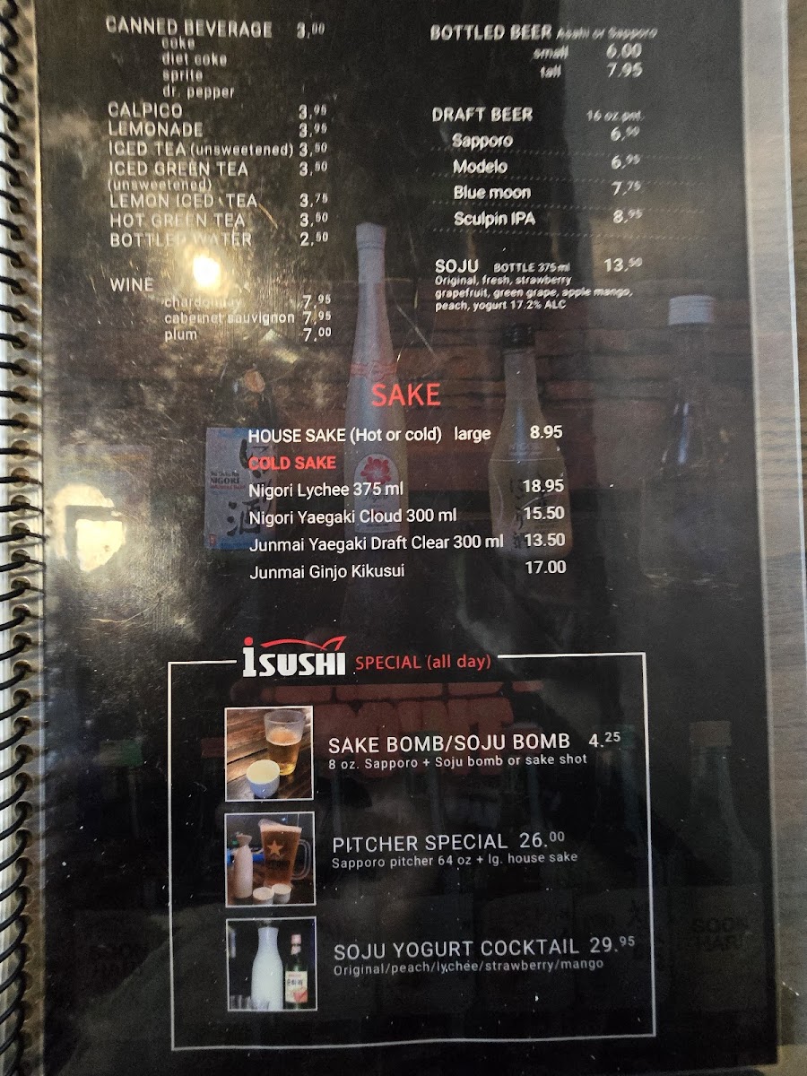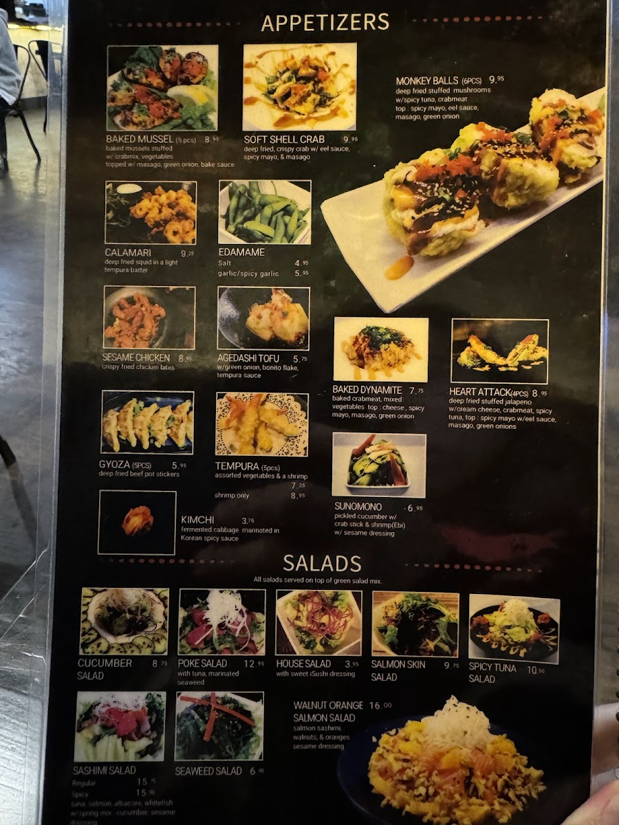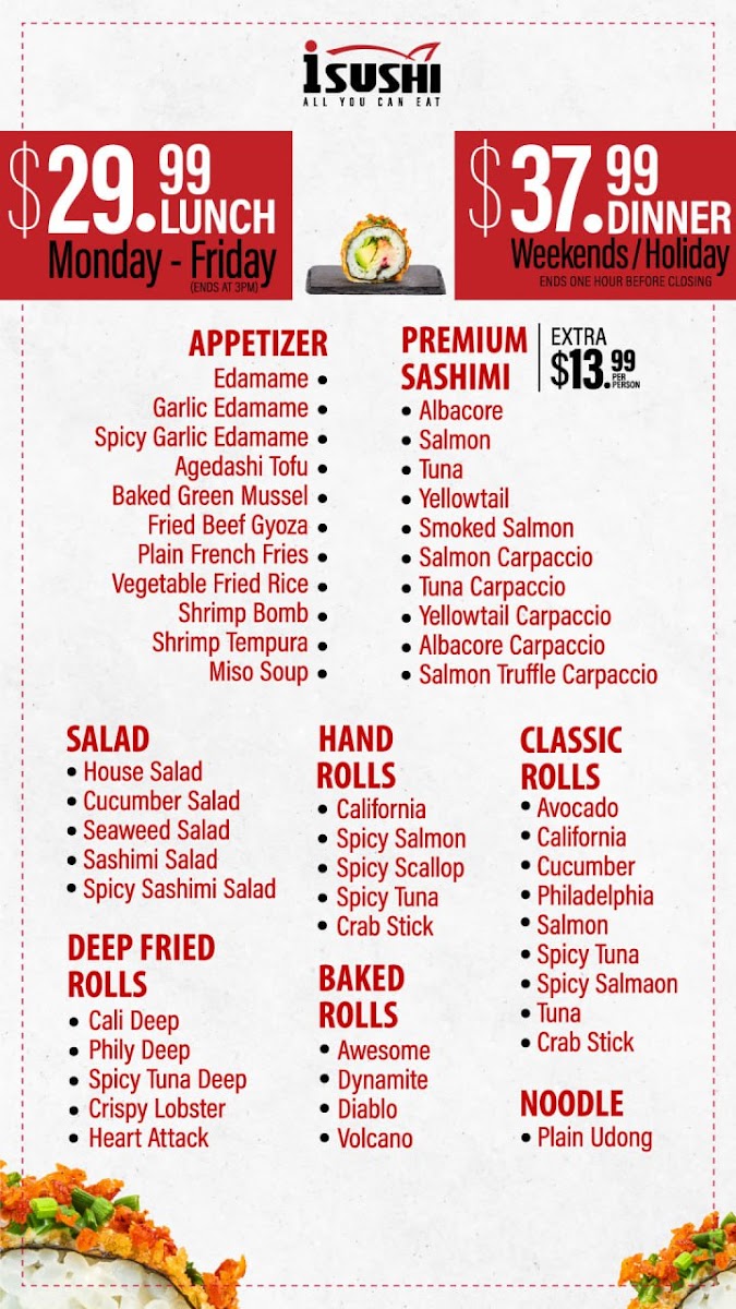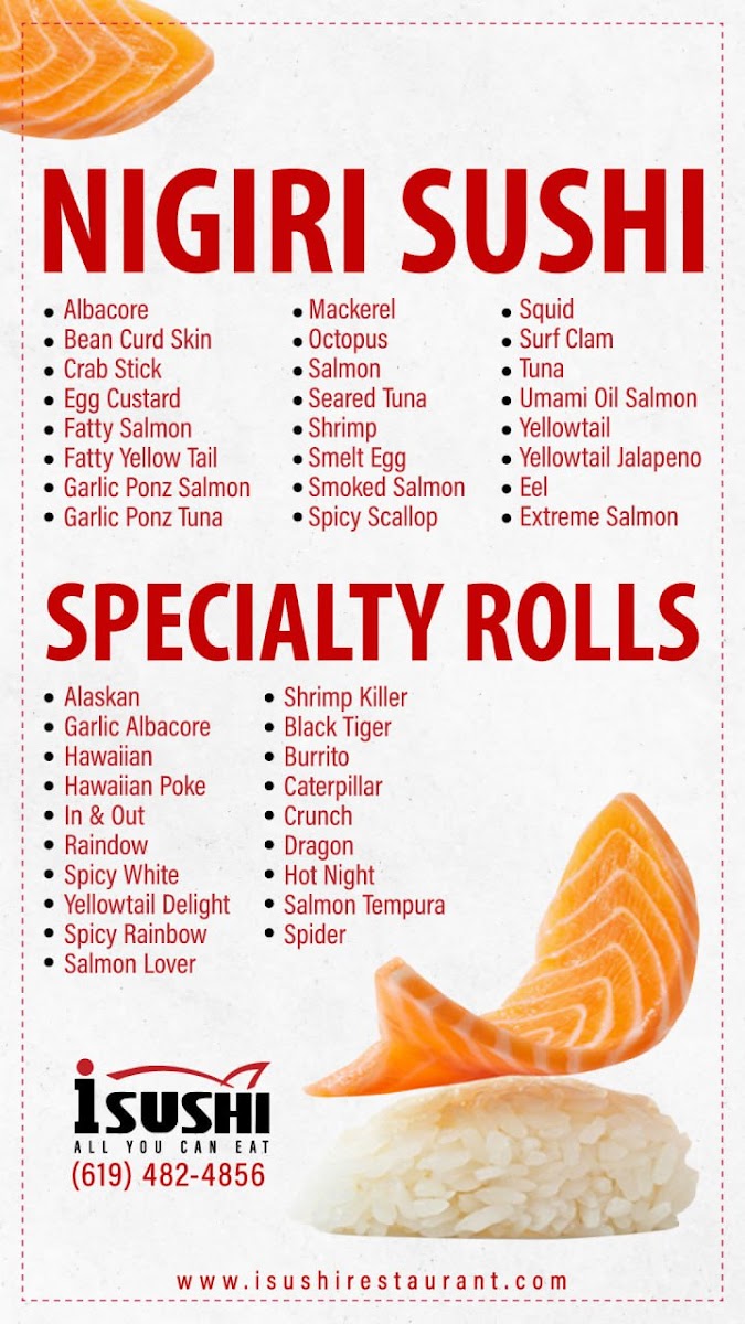 Preparation choice: regular or spicy. Tuna, salmon, albacore, white fish, spring mix, cucumber with i-sushi dressing.