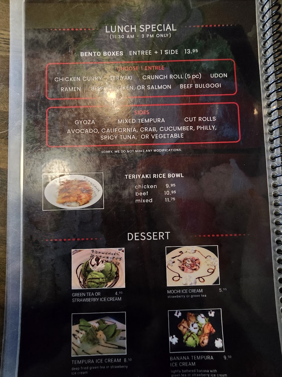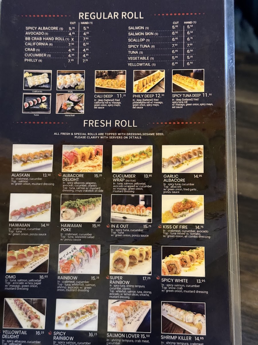 In: Shrimp Tempura, Spicy Tuna, Cream Cheese Top: Tuna, Yellowtail, Avocado, Lemon, Jalapeno, Ponzu Sauce