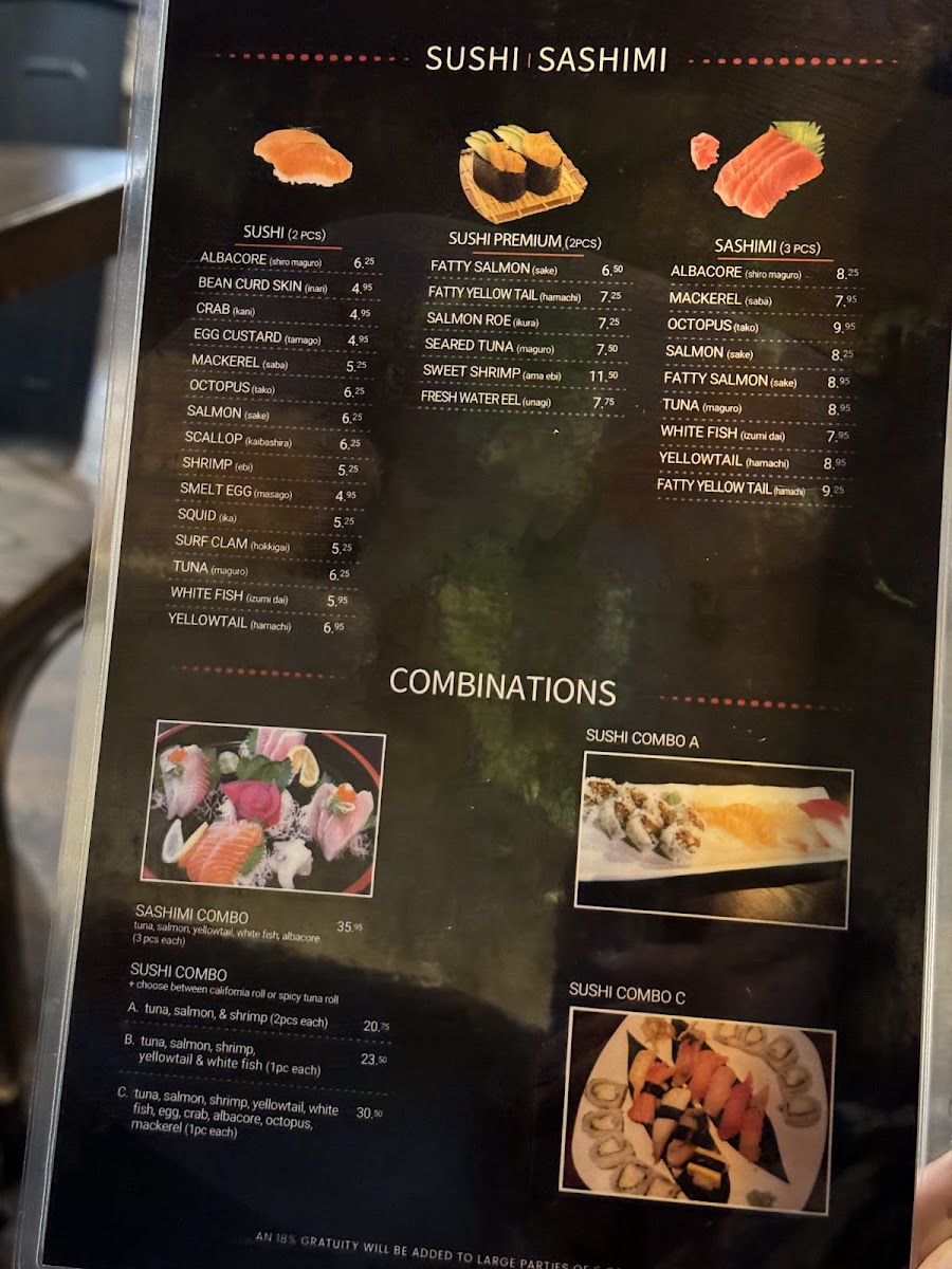 Tuna, salmon, yellowtail, white fish, albacore (3pcs each)